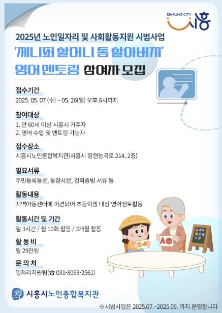 조현자 시흥시 노인복지과장은 “이번 시범사업은 어르신들에게는 새로운 일자리가 되고, 아이들에게는 유익한 영어 학습의 기회가 될 것”이라며 “어르신의 경험과 지혜까지 전하는 새로운 노인일자리 모델이 될 것”이라고 말했다.