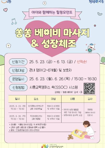 이번 프로그램은 생후 2개월부터 6개월까지의 관내 영아와 보호자를 대상으로 진행된다. 아이의 성장 발달을 촉진하고 보호자와의 유대감을 높일 수 있는 기본 마사지 기법과 성장 체조 교육이 중심 내용이다. 전문 베이비 마사지 강사인 모윤정 씨가 교육을 진행한다.