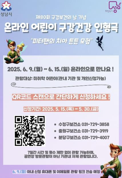 성남시 온라인 구강건강 인형극 ‘피터팬의 치아튼튼 모험’ 관람신청 안내 포스터