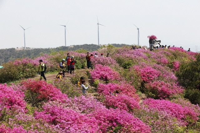 | ▲ 지난해 경남 의령군 한우산을 찾은 관광객들이 활짝 핀 철쭉꽃을 배경으로 기념촬영하고 있는 모습.<사진제공=의령군청> |