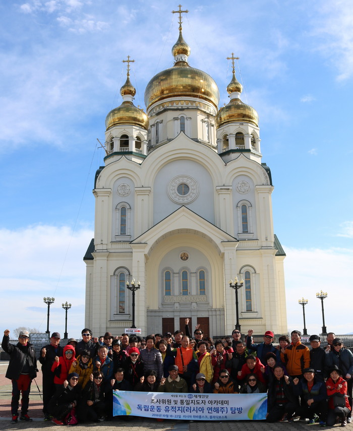 ▲ [세계일보 이우춘 조사팀장] 세계일보 조사위원과 통일지도자 아카데미 수강생들로 구성된 러시아 연해주 독립운동 유적지 탐방단이 지난 19일 러시아 하바롭스크시의 꼼소몰스크 광장에서 기념촬영하고 있다.