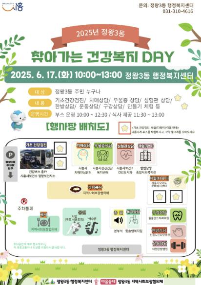 [세계로컬타임즈] 시흥시 정왕3동 지역사회보장협의체는 오는 6월 17일 오전 10시부터 오후 1시까지, 정왕3동 행정복지센터 주차장에서 ‘2025년 찾아가는 건강복지데이’를 개최한다. 이번 행사에는 주민 누구나 참여할 수 있다.