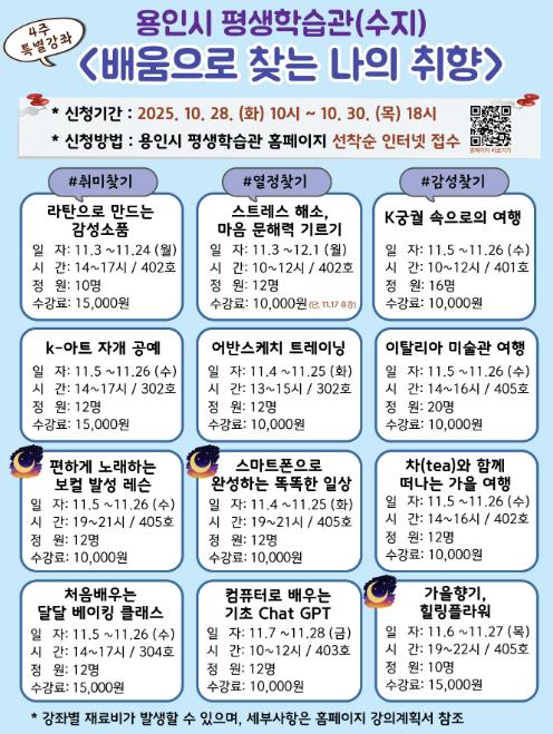 용인시 관계자는 “시민들이 배움의 즐거움을 느낄 수 있도록 실용적이고 유익한 교육 프로그램을 꾸준히 확대해 나가겠다”고 말했다.