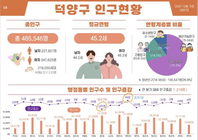 행정동별로 인구규모와 연령구조, 세대 구성, 인구 증감 양상도 서로 다르게 나타났다. 일산동구 장항1동과 덕양구 대덕·효자동은 청년·신혼부부 유입으로 비교적 젊은 인구구조를 보이는 반면, 덕양구 관산·주교동과 일산동구 고봉동은 고령인구 비중이 높아 돌봄·의료·복지 수요가 빠르게 증가하는 등 지역 간 인구구조 격차가 확대되고 있다.