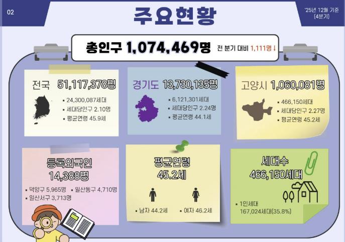 ‘고양시 인구현황 브리핑’ 자료는 고양시 홈페이지 정보공개–행정자료방에서 확인할 수 있다. 시는 2026년을 시작으로 분기별 브리핑을 정례화하고, 누적 데이터를 기반으로 장기적인 인구변화 추이를 비교·분석해 나갈 계획이다. 시민 의견을 반영한 기획특집도 확대해 인구 데이터를 보다 친숙하고 이해하기 쉬운 형태로 발전시켜 나갈 방침이다.
