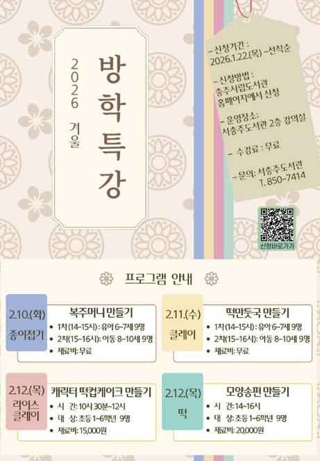 모집 인원은 유아 및 어린이 54명이며, 프로그램은 2월 10일부터 12일까지 3일간 서충주도서관 2층 강의실에서 진행된다.