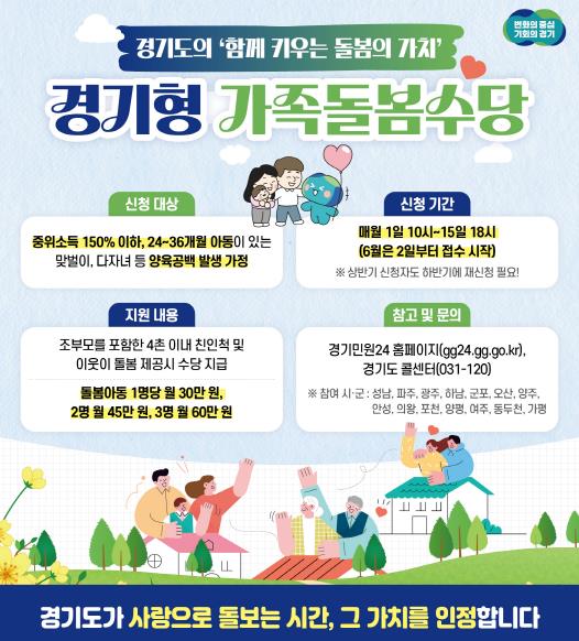 경기형 가족돌봄수당은 중위소득 150% 이하, 24~36개월 아동이 있는 양육공백 발생 가정에 조부모를 포함한 4촌 이내 친인척 및 이웃이 돌봄을 제공할 경우 수당을 지급해 자녀 양육부담을 경감하고 돌봄의 가치를 인정하는 사업이다.