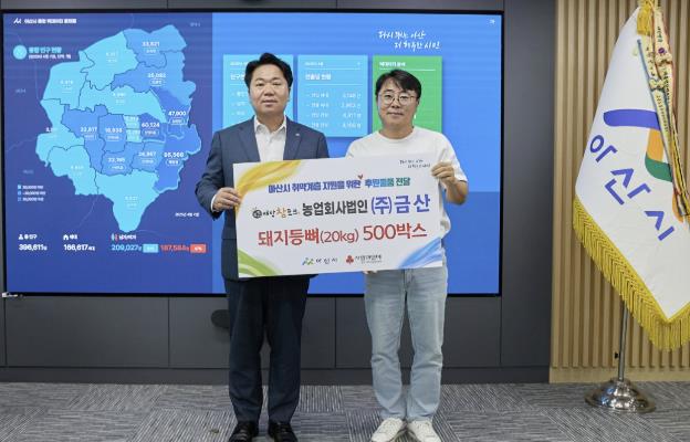 [세계로컬타임즈] 농업법인회사 ㈜금산은 23일 아산시를 방문해 돼지등뼈 20kg 500박스(약4,200만 원 상당)를 후원하며 따뜻한 나눔을 실천했다.