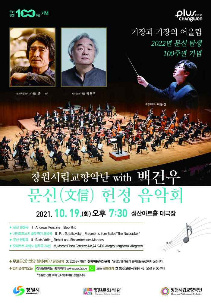 이날 창원시에 따르면 ‘거장과 거장의 어울림’이라는 주제로 열리는 이번 음악회는 국내 정상급으로 인정받고 있는 창원시립교향악단이 객원지휘자 이동신의 지휘로 독일 작곡가들이 문신의 조각 작품에 감흥돼 작곡한 헌정곡을 연주한다. 아울러 문신과 각별한 인연을 지닌 피아니스트 거장 백건우가 함께 협연을 펼쳐 문신 탄생 100주년의 특별한 의미를 더할 예정이다.