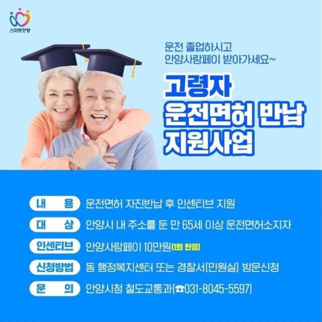시는 관내 65세 이상(1958년 12월 31일 이전 출생) 고령 운전자가 자발적으로 운전면허를 반납할 경우, 1회에 한해 안양사랑상품권 10만원을 지원한다.