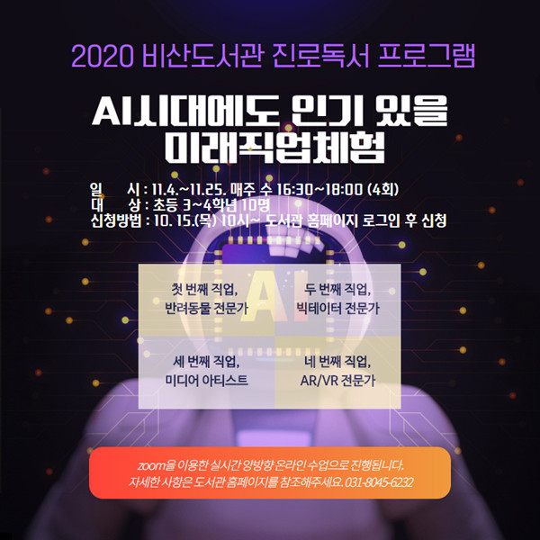 이번 온라인 프로그램은 비산도서관에서 11월 4일~25일 매주 수요일 오후 4시30분 화상교육 프로그램 ‘줌’을 통해 모두 4회 진행된다. 초등학생 3~4학년을 대상으로 비산도서관 홈페이지를 통해 참여자 10명을 선착순으로 접수한다.