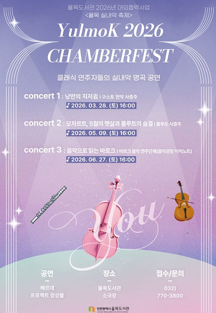 전유도 시 문화체육국장은“율목 실내악 축제를 통해 시민들이 도서관에서 음악과 여유를 함께 느낄 수 있기를 기대한다”며“앞으로도 독서문화와 공연예술이 조화를 이루는 다양한 문화행사를 지속적으로 확대해 시민 중심의 문화서비스를 제공하겠다”고 말했다.