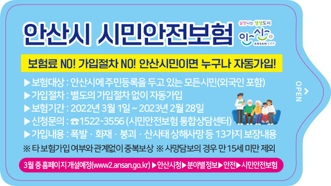 이에 따라 올해 처음 안산시 시민안전보험이 시행되며, 안산시에 주민등록을 두고 거주하는 모든 시민은 별도 가입절차 없이 다음달 1일부터 자동으로 보험가입자로 등록된다.