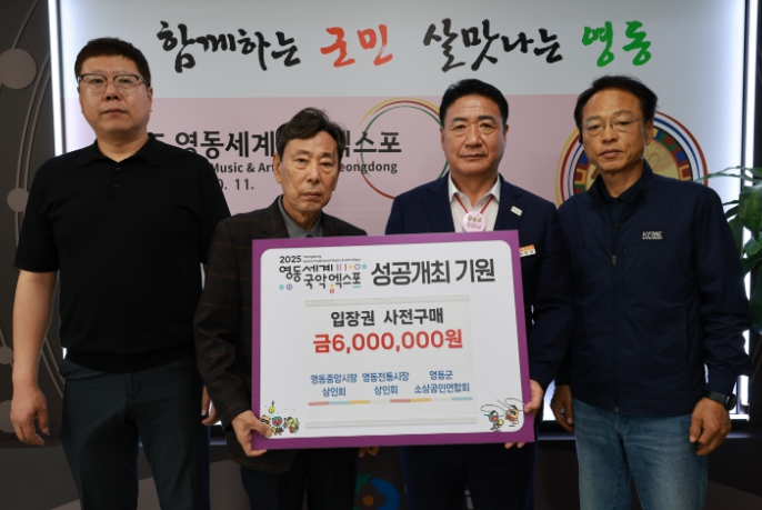 성백헌·이현철·홍종범 회장은 “영동세계국악엑스포의 성공적인 개최를 위해 지역상인들이 도움이 되고자 입장권을 구매했다”며 “영동군의 발전과 도약을 위해 적극 협조하겠다”고 말했다.
