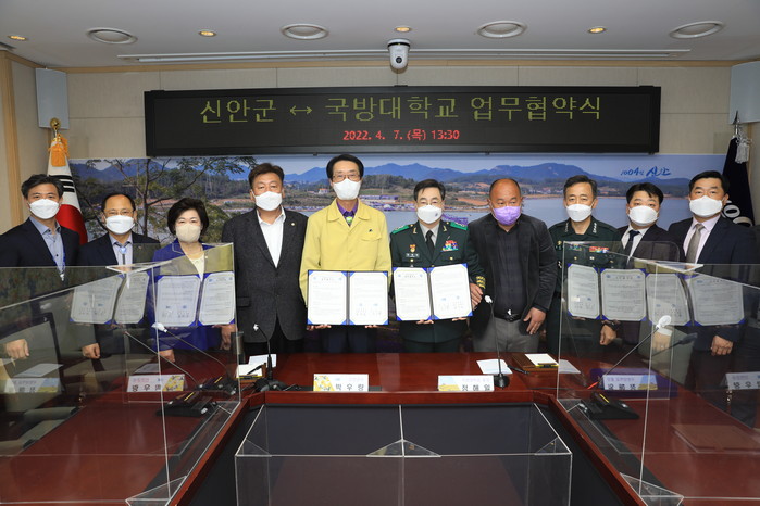 군청 영상회의실에서 진행한 협약식에는 신안군수와 국방대학교 정해일 총장이 참석해ㅆ.