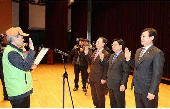 | ▲ 지난 3일 대전시청 대강당에서 열린 ‘2017. 꿈나무지킴이 사업’ 참여자 발대식에서 노인 대표가 선서를 하고 있다.<사진제공=대전시청> |