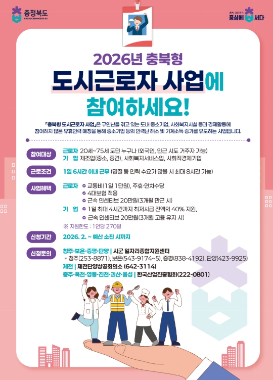 충북형 도시근로자 지원사업은 지역 생산 현장에 단시간(6시간 이내) 근로를 희망하는 유휴인력을 중소·중견기업에 연계하여 인력난을 해소하고 일자리를 창출하기 위해 추진하는 사업이다.