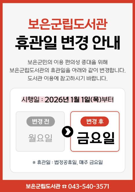 이미화 군 행복누리팀장은 “그동안 제기돼 온 이용자 불편 사항을 반영해 휴관일을 조정하게 됐다”며 “앞으로도 도서관 운영 전반에 대해 군민들의 의견을 꾸준히 살피고, 보다 편리하고 접근성 높은 도서관 환경을 만들어 나가겠다”고 말했다.