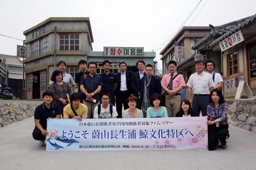 ▲ 울산시 남구가 고래관광산업 활설화를 위해 일본 현지 여행사와 국내 여객선 관계자들을 초 청해 팽투어를 진행하며 단체로 기념촬영하고 있다.<사진제공=남구청> |