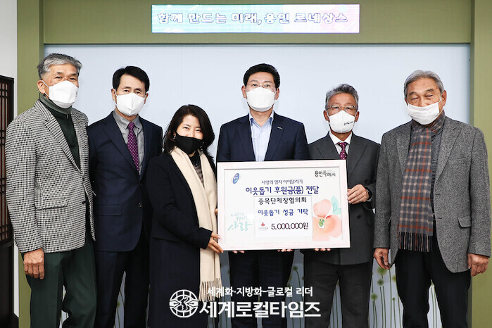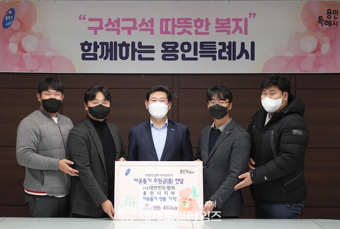 | ▲ 용인시종목단체장협의회 회원들이 이상일 용인특례시장실을 방문, 이웃돕기 성금 500만원을 전달했다. (사진=용인시) |