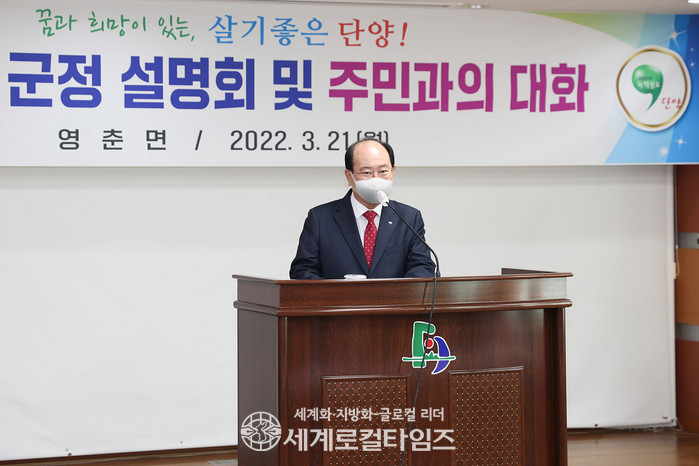 코로나19 여파로 3년 만에 추진되는 군정 설명회는 지난 21일 영춘면과 가곡면을 시작으로 22일 단성·대강면, 23일 적성면, 24일 매포읍, 25일 어상천면, 28일 단양읍 등 8개 읍.면을 순회하며, 6일간 진행된다.