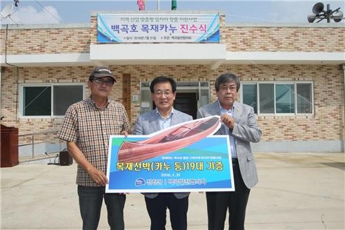 또 진천군은 이날 진수식을 기념해 작년 10월 한국건설생활환경시험연구원으로부터 기증받은 목재선박 19대를 백곡발전협의회에 기증했다.