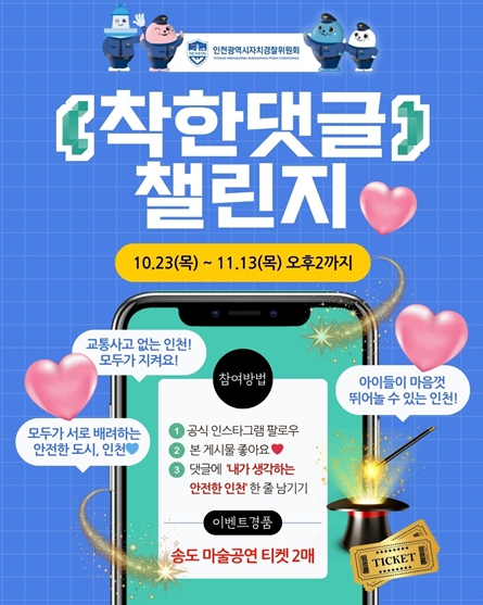 [세계로컬타임즈] 인천광역시는 시민과의 공감과 소통을 강화하고 생활 속 안전 문화를 확산하기 위해 인천광역시자치경찰위원회 공식 인스타그램 채널을 개설하고, 10월 23일부터 11월 13일 14:00까지 ‘내가 생각하는 안전한 인천, 한 줄 남기기’ 착한 댓글 챌린지를 진행한다고 밝혔다.