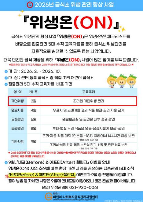 ‘위생 온(ON)’사업은 2025년 위생·안전 점검표 결과 분석을 바탕으로 미흡 빈도가 높은 항목을 중점 관리 항목으로 선정해 집중 관리를 지원하는 프로그램으로, 급식소의 자율 위생 관리 역량 강화를 목표로 한다.