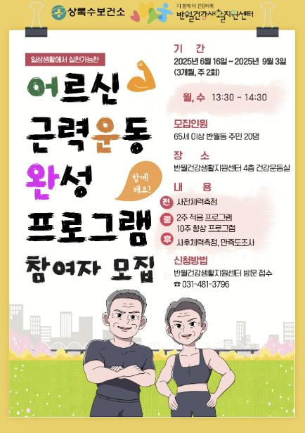 이번 프로그램은 6월부터 9월까지 적응 운동 2주 포함 총 12주 프로그램(매주 2회 월요일, 수요일 오후)으로 진행된다. 반월건강생활지원센터 4층 건강운동실에서 열리며, 접수 등 기타 문의는 반월건강생활지원센터(031-481-3796) 2층으로 방문하면 안내받을 수 있다.