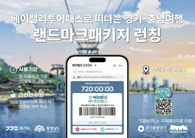 [세계로컬타임즈] 경기도와 경기관광공사가 6월 ‘베이밸리 투어패스’ 대표상품인 통합이용권 본격 판매에 앞서 29일부터 경기 남부 및 충남 북부 대표 관광지를 묶은 ‘랜드마크 패키지’ 상품을 출시, 판매에 들어간다. ‘베이밸리 투어패스’는 경기 남부권(시흥, 화성, 안산, 평택, 안성)과 충남 북부권(천안, 아산, 서산, 당진, 예산)을 연결하는 ‘베이밸리 메가시티’ 정책에 기반해 기획된 초광역 관광상품이다.