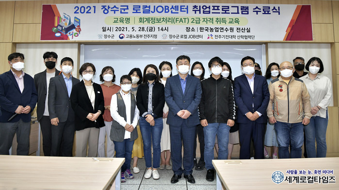 [세계로컬타임즈 조주연 기자] 전북 장수군 로컬JOB센터가 2021년 회계정보처리(FAT) 2급 자격증 취득교육을 마치고 한국농업연수원 전산실에서 수료식을 가졌다.