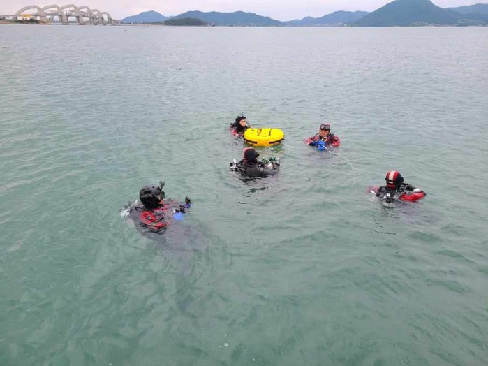 | ▲서해지방해양경찰청 과학수사요원과 중앙해양특수구조단 서해해양특수구조대원이 지난 14일 전남 영암군 영암방조제 인근 해상에서 합동 수중과학수사 훈련을 하고 있다.(사진=서해지방해양경찰) |