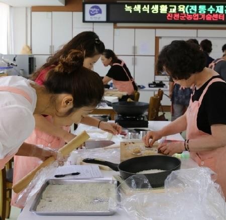 ▲ 진천군농업기술센터 생활과학관에서 수강생들이 전통 수제 간식인 한과 만들기 실 습을 진행하고 있다. <사진제공=진천군청> |
