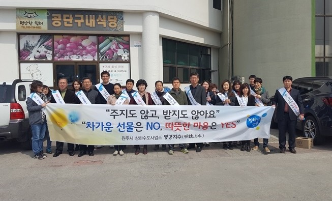 28일 원주시에 따르면 명경지수는 지난 24일 상하수도사업 추진과 밀접한 관련이 있는 태장농공단지 직원들을 대상으로 청렴캠페인을 전개했다.