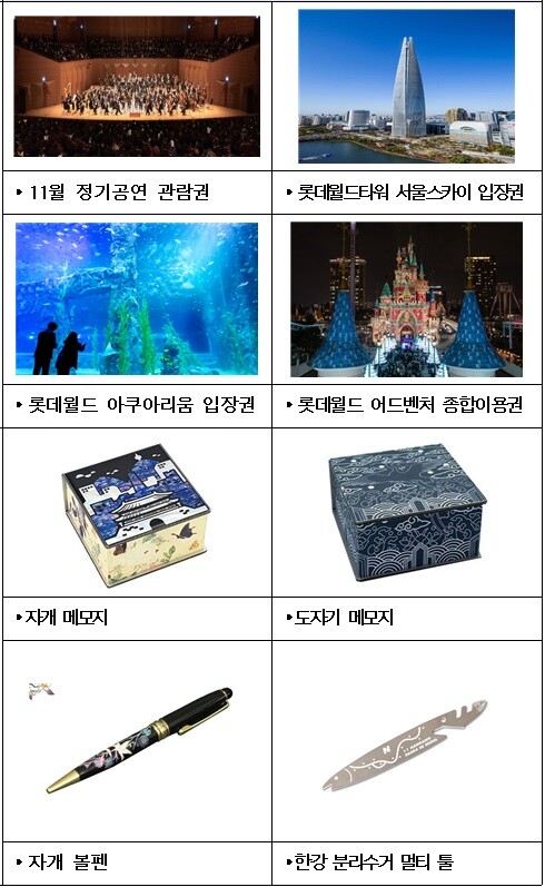 새로 선정된 입장권은 ▲ 2023년 11월에 열리는 서울시향 정기공연 관람권 ▲ 어드벤처 종합이용권(종일권), 아쿠아리움 관람권, 서울스카이 입장권(이상 롯데월드)으로 구성됐다.