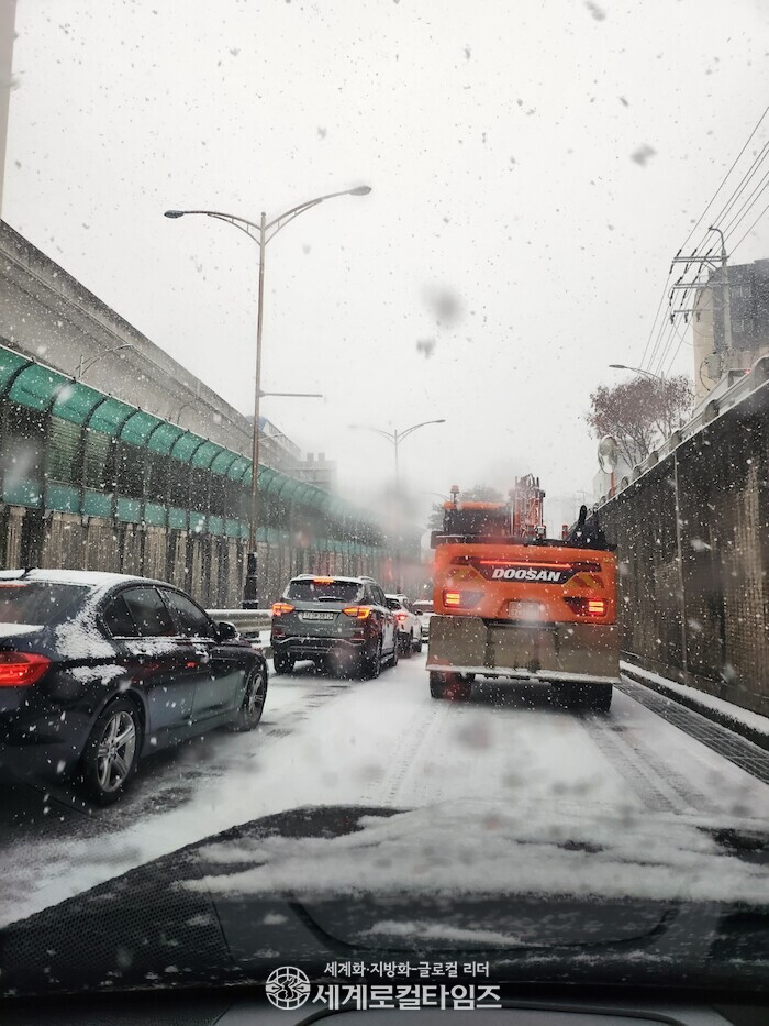 [세계로컬타임즈 이지안 기자] 용인시 동백 죽전대로 처인구 방면, 오늘 새벽부터 내린 눈으로 도로위 자동차가 한시간째 멈춰 있는 등 출근길 혼잡을 빚고 있다.