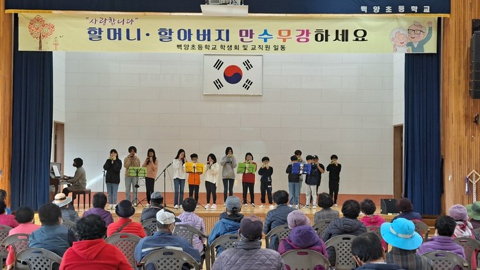 | ▲ 백양초등학교는 지난 17일 학교 강당에서 동일면 어르신을 모시고 위로 공연을 진행했다.(사진=백양초) |
