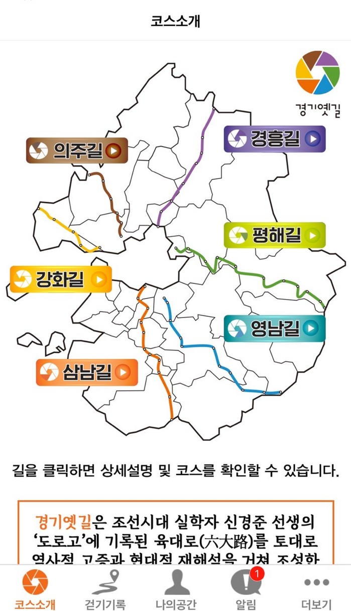 처음 걷는 이들에게 유용한 ‘따라가기’ 기능을 더해 GPS 정보를 이용해 경기옛길 노선을 안내하고, 노선을 이탈했을 경우 경보음이 울리도록 해 혼자서도 안전하고 편리하게 탐방을 즐길 수 있도록 돕는다.