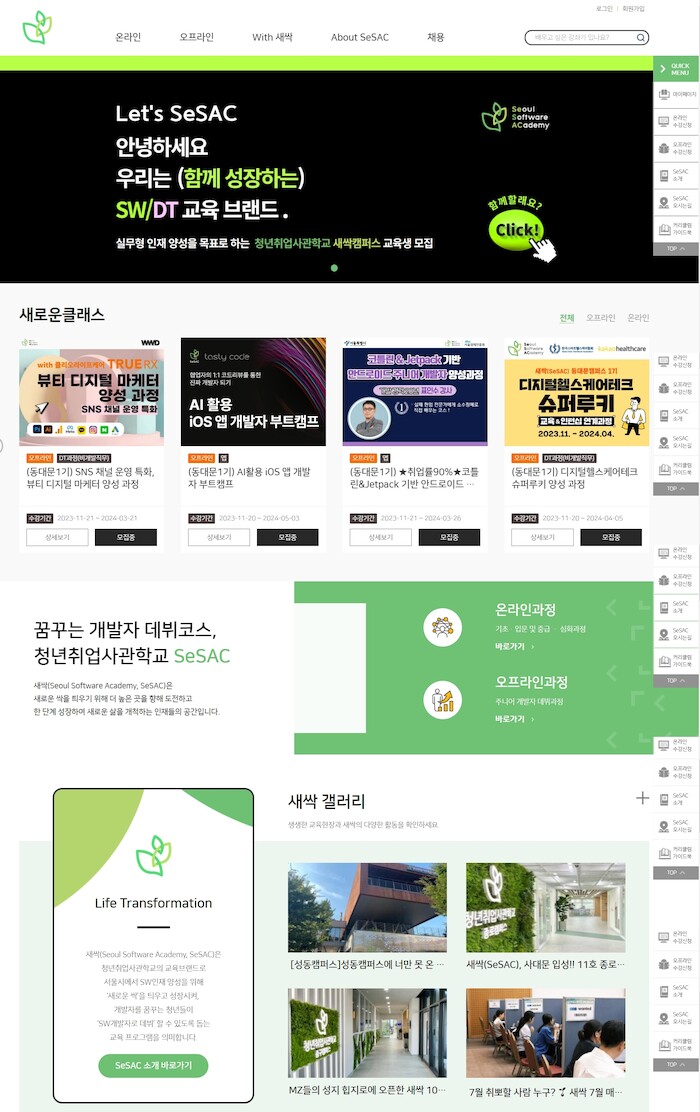 ‘청년취업사관학교(SeSAC, 새싹)’는 청년구직자들에게 디지털 신기술 분야 실무교육부터 멘토링, 취·창업연계까지 전 과정을 지원하는 청년 디지털 인재 양성기관이다.