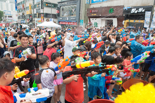 | ▲ 오는 13일까지 매주 토 일요일 낮 1시부터 3시까지 펼쳐지는 도심속 물놀이난장에 참여한 시민들이 물총싸움을 즐기고 있다.<사진제공=태백시청>. |