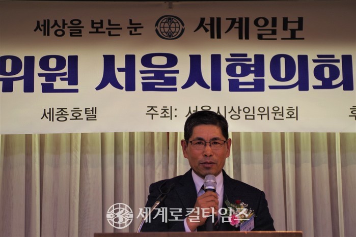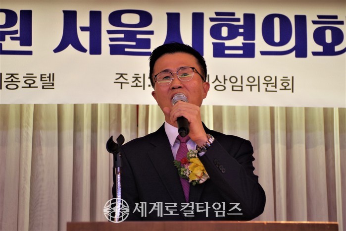 | ▲ 최광배 세계일보 조사위원 서울시 상임위원회 회장이 송년사를 하고 있다. |