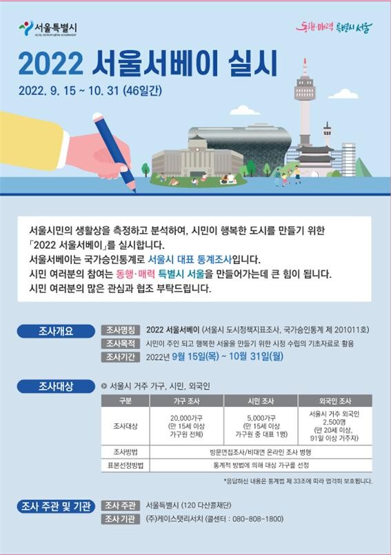 [세계로컬타임즈 이효진 기자] 서울시는 오는 10월 31일까지 2022년 ‘서울시도시정책지표조사(이하 서울서베이)’를 실시한다.