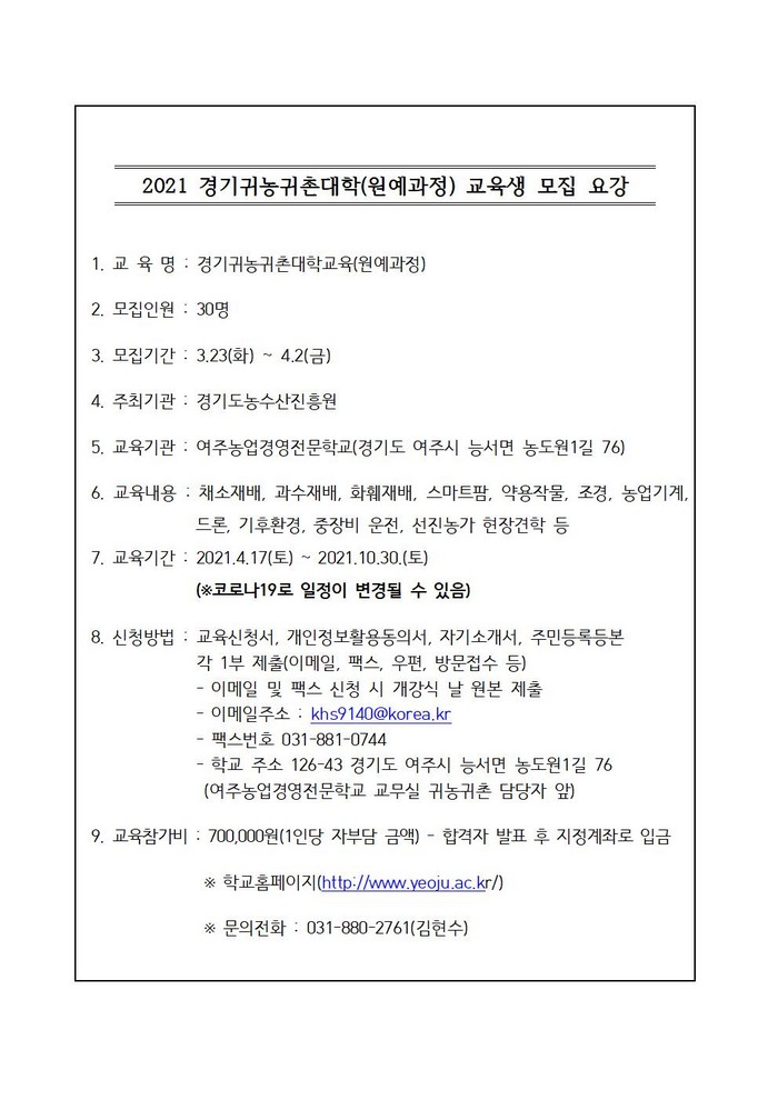 [세계로컬타임즈 이배연 기자] 경기도와 경기도농수산진흥원이 운영하는 경기도귀농귀촌지원센터가 ‘2021 귀농귀촌대학’ 참여 교육생을 모집한다.