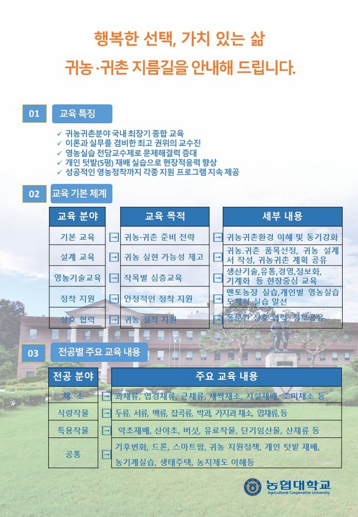 ‘귀농귀촌대학’은 귀농·귀촌을 희망하는 도시민을 대상으로 현장 중심의 이론·실습형 교육을 통해 성공적 농촌 정착을 돕기 위한 교육프로그램으로 지난 2009년부터 2,553명이 귀농·귀촌교육을 이수했다.