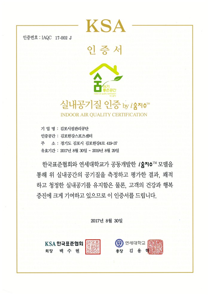 [세계로컬신문 유영재 기자] 경기도 김포시시설관리공단(이사장 조성범)는 김포한강스포츠센터가 김포지역 스포츠시설 중 최초로 한국표준협회(KSA)가 시행하는 ‘실내 공기질 인증 by 아이(i)숨지수’를 획득해 인증 받았다고 17일 밝혔다.