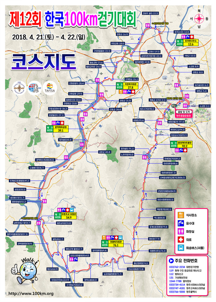 원주종합운동장에서 시작해 원주시 일대인 호저면, 문막읍, 귀래면, 무실동으로 돌아 출발 지점으로 도착하는 코스로 100km를 걸을 수 있는 만 19세 이상 신체 건강한 사람은 누구나 신청할 수 있다.