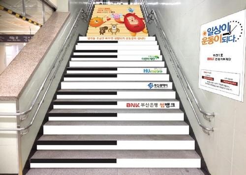 ▲ 부산 지하철 2호선 경성대부경대역에 설치된 '건강기부계단' 모 습. <사진제공=부산시청> |