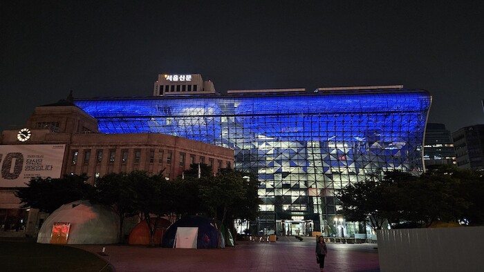 [세계로컬타임즈 이효진 기자] 15일 저녁 8시부터 10시까지 2시간 동안, 서울특별시청 외관이 흰색, 파란색으로 물든다.