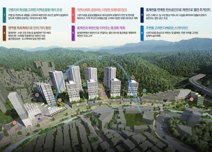 또한 홍제천변 개방감 확보, 북한산 능선에서 홍제천으로 연결되는 순응형 스카이라인 등 다채로운 도시경관 창출도 도모했다.