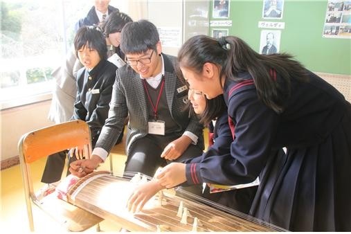▲ 서귀포시가 11일부터 14일까지 3박 4일 간 자매도시인 일본 가시마시를 방문해 청소년 홈스테 이 교류 행사를 추진한다. 사진은 지난해 한일 청소년 교류행사에서 학생들이 전통악기를 소개하 고 있는 모습.<사진제공=서귀포시청> |